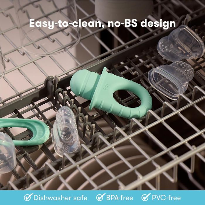 • Fill the silicone feeder with fresh or frozen fruits, vegetables, yogurt, purees, breast milk, or ice cubes. It’s the perfect fruit teether for babies.